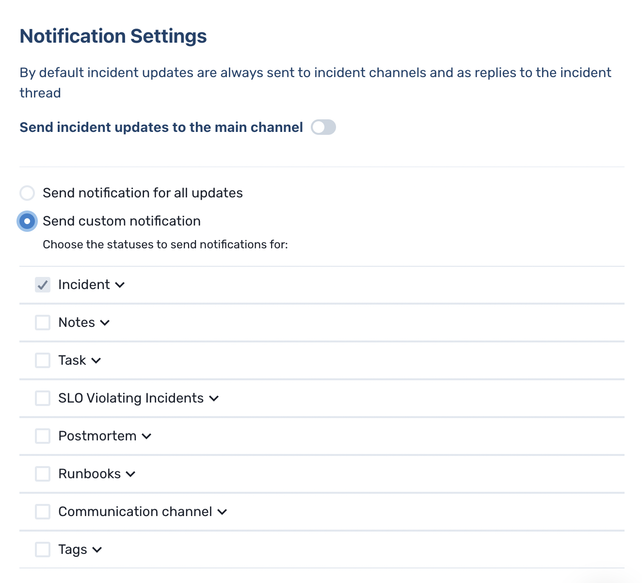 You can now configure a default Slack channel for the entire account. There is an option to either select the channel from the dropdown or by entering the channel ID. In the previous version, it was challenging to determine which incidents the notifications were intended for, because each action or update notification was issued as a separate notification in the main channel. Now all the update notifications will be sent under the same incident thread and also on the main channel, making it easier to keep track of updates. You can also opt-out from receiving notifications on the main channel by deselecting the ‘Send incident updates to the main channel’ button’.